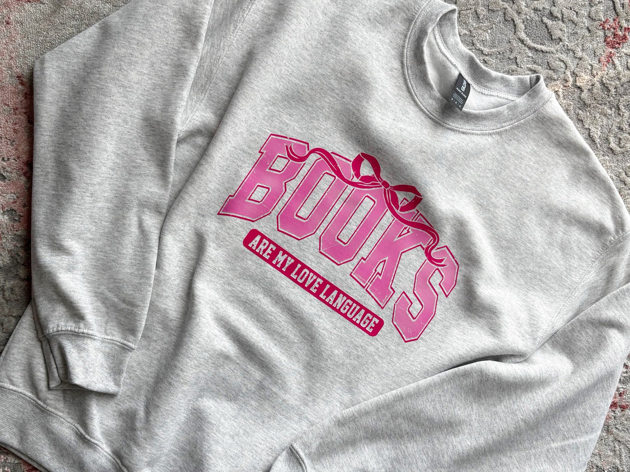 Books are my love language design pressed on Gildan ash grey crewneck sweatshirt.