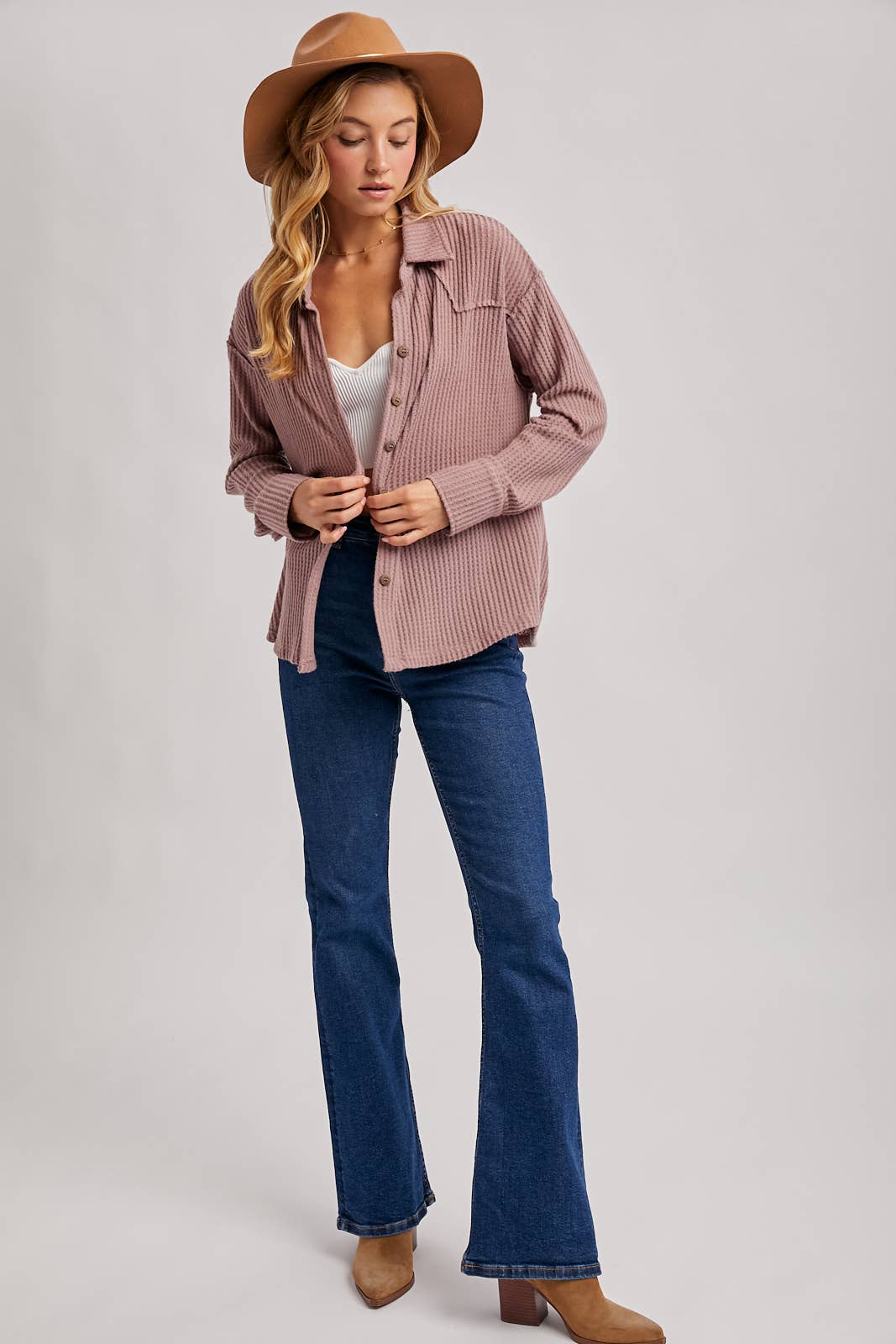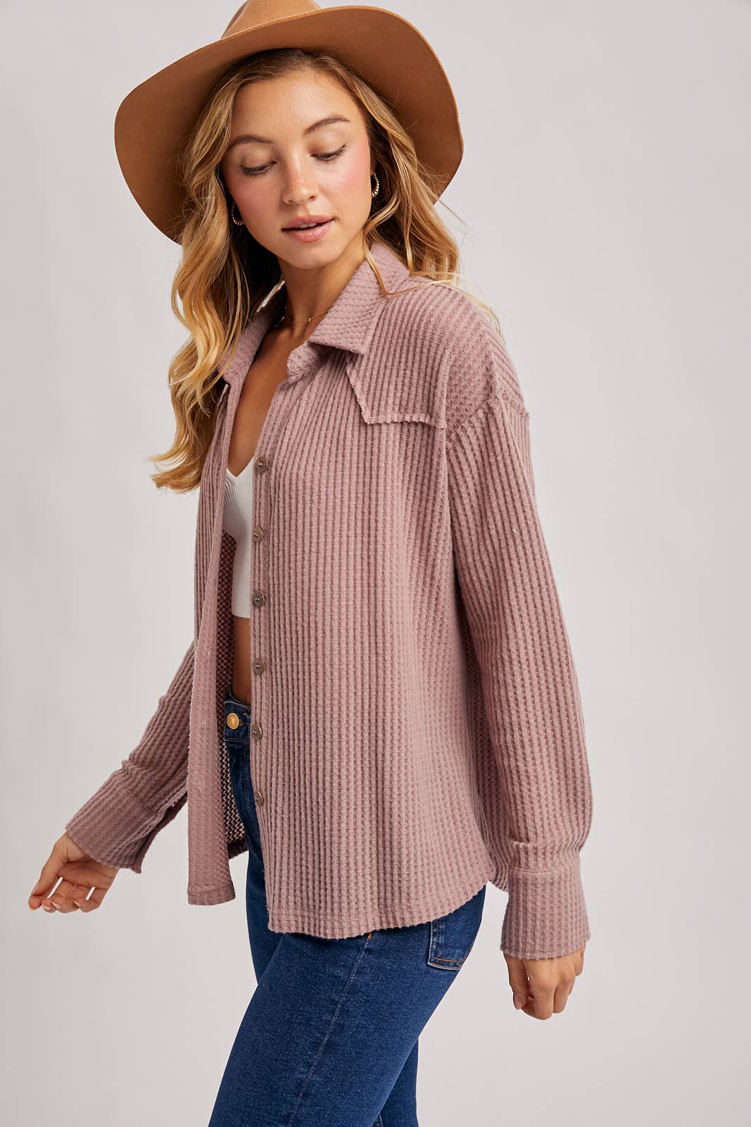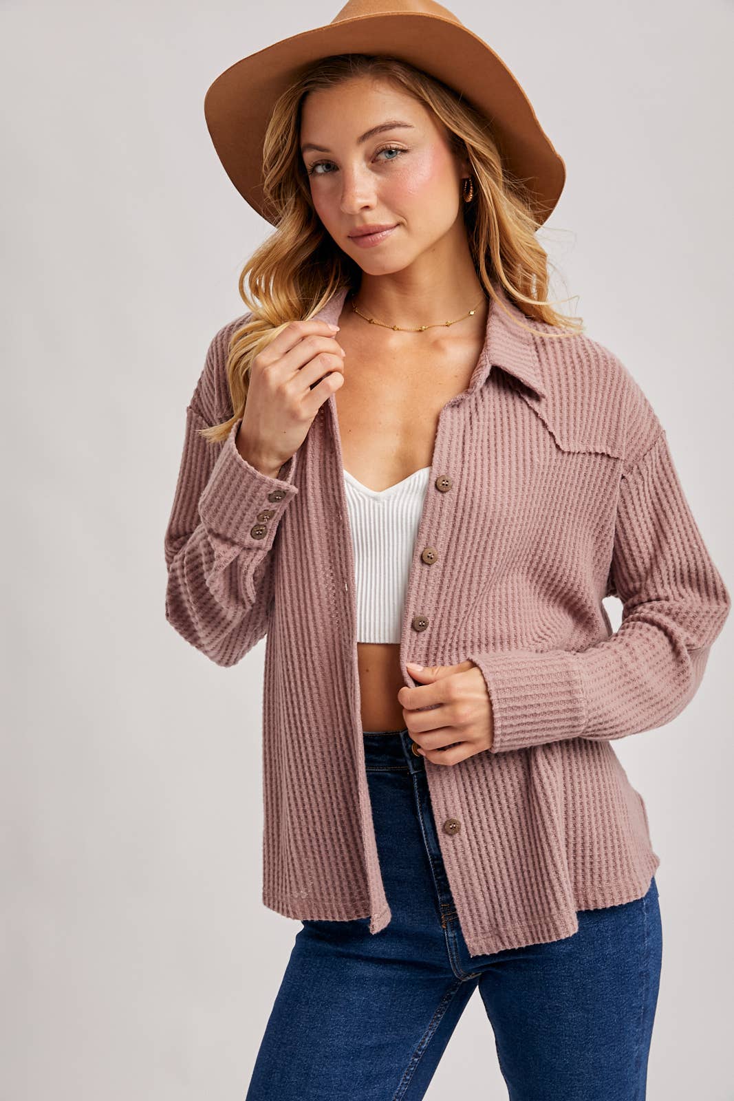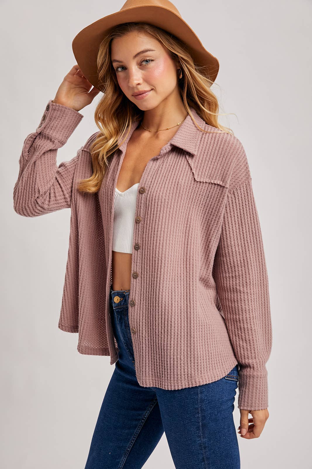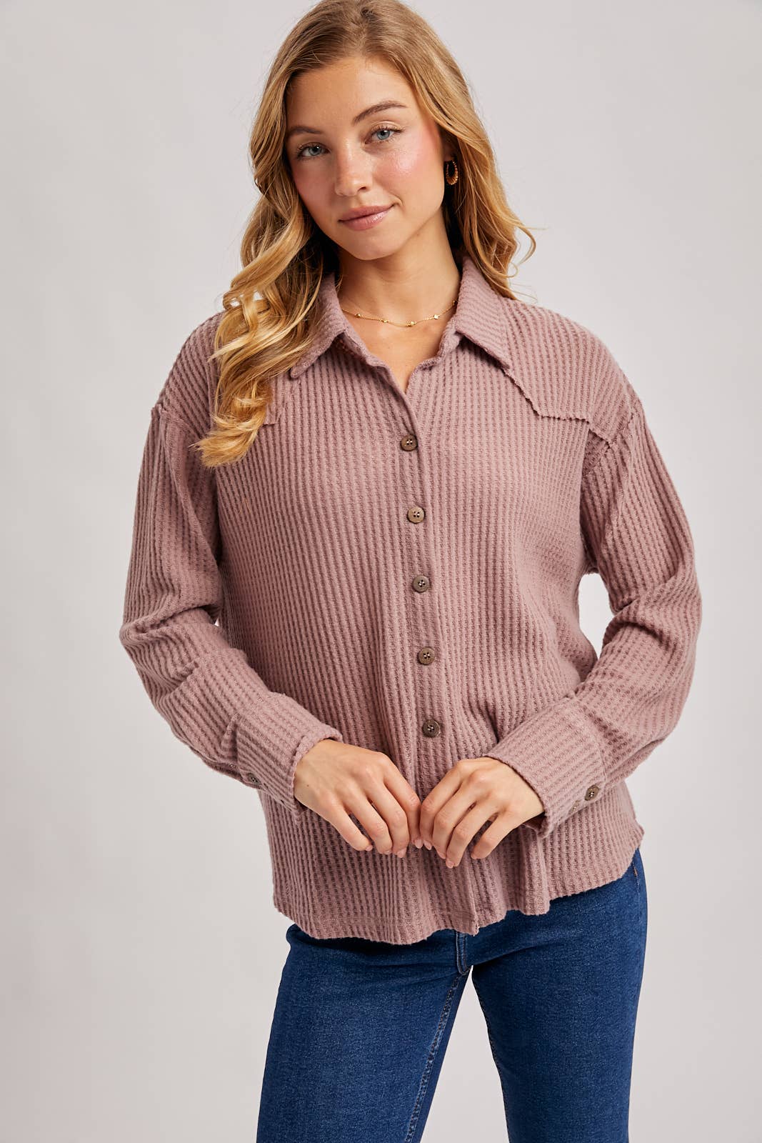 Mauve soft brushed waffle knit top featuring a button up front, collared neckline, dropped shoulder with long sleeves, relaxed fit.