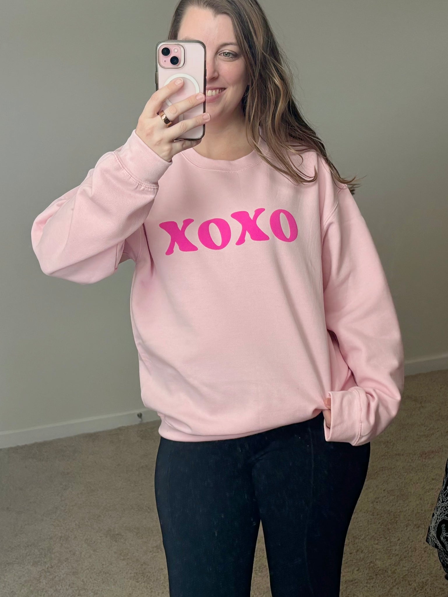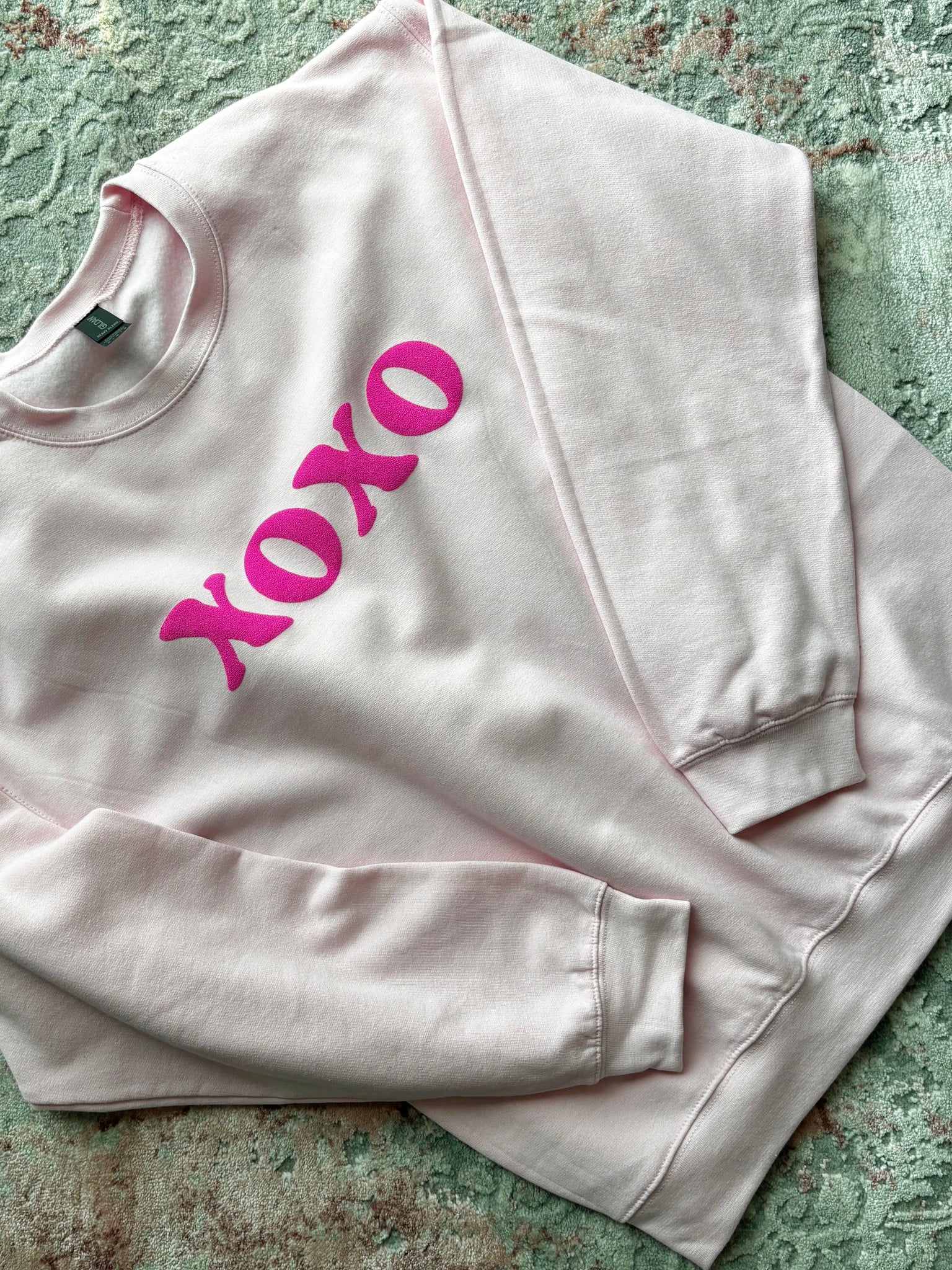Fuchsia puff “XOXO” design on light pink Gildan crewneck sweatshirt.